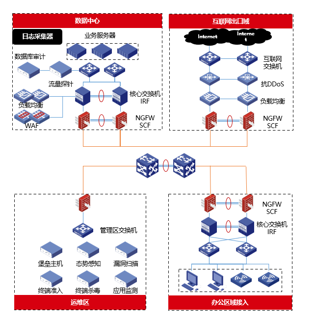 ·互联网出口区:对内外网的流量进行过滤,抵抗外网主机对内网服务器、用户终端进行攻击,保证企业业务的正常开展,有效阻止内网用户对外网非法访问请求。